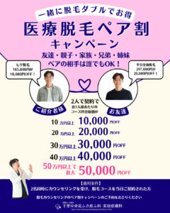 2名でカウンセリングご予約、当日ご契約の場合金額に応じてそれぞれお得な割引が受けられます✨