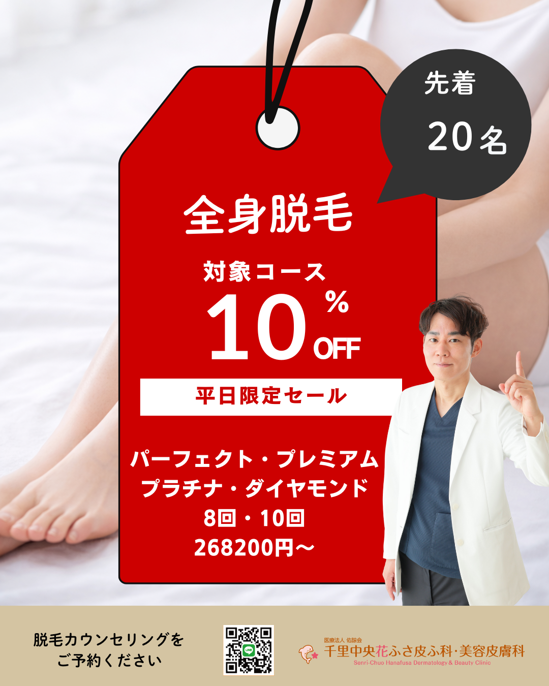 | 全身ブロンズコース(体全体+首前面) | 60分 | 198,000円 | 238,000円 | 298,000円 | 全身プラチナコース(体全体+首前面+VIOor顔) | 75分 | 242,000円 | 328,000円 | 398,000円 |